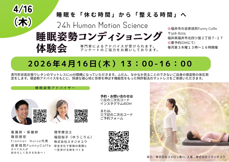 2026年4月16日(木)13:00~16:00に、福井市のあんしん村という介護付き有料老人ホームの一角にある、自家焙煎Funny Coffe コワーキングスペースにて、ノビプロパートナーでもある株式会社スタジオユウ 代表 福田裕子先生およびFunny Coffe 代表 篠田朋宏先生による、『睡眠姿勢コンディショニングデバイス』無料体験会を開催します。